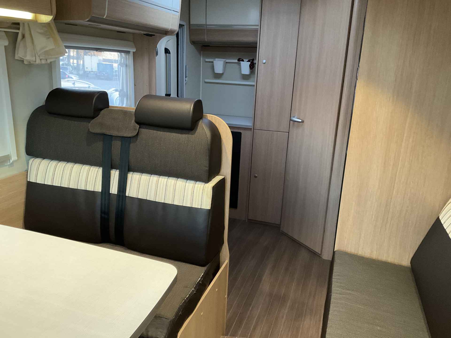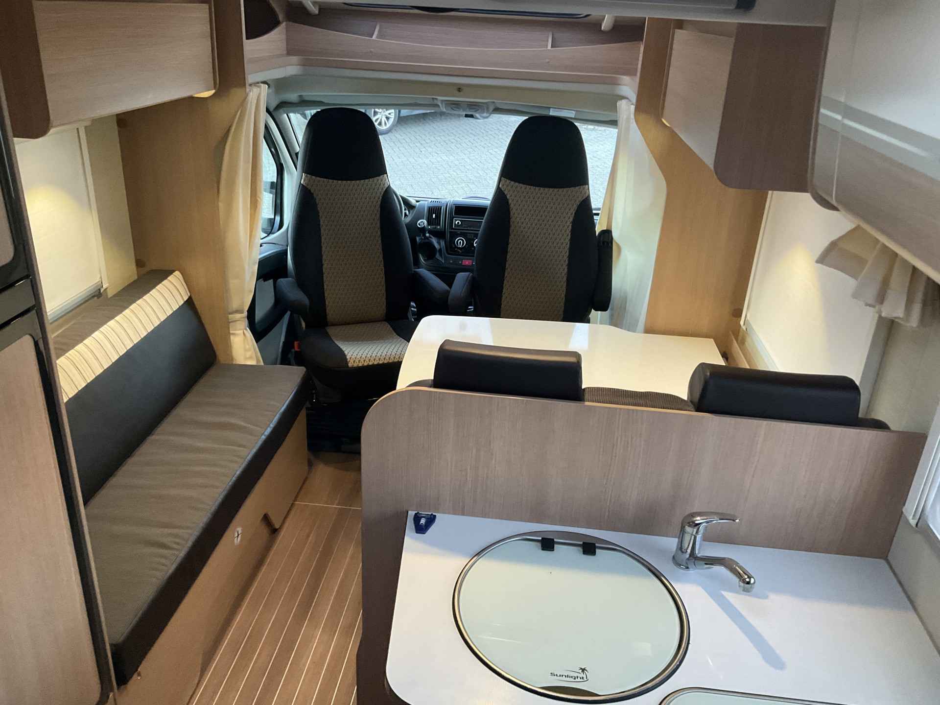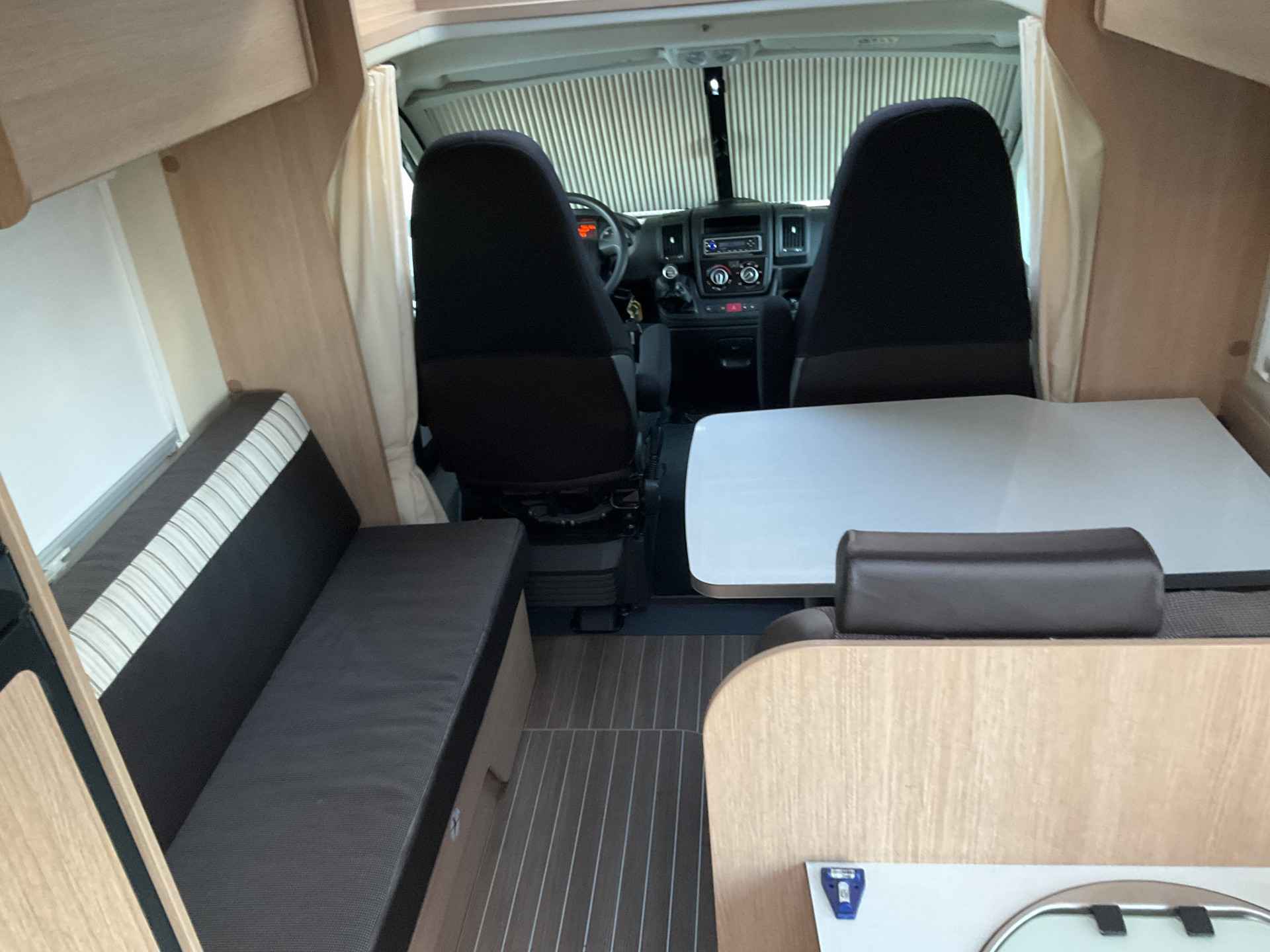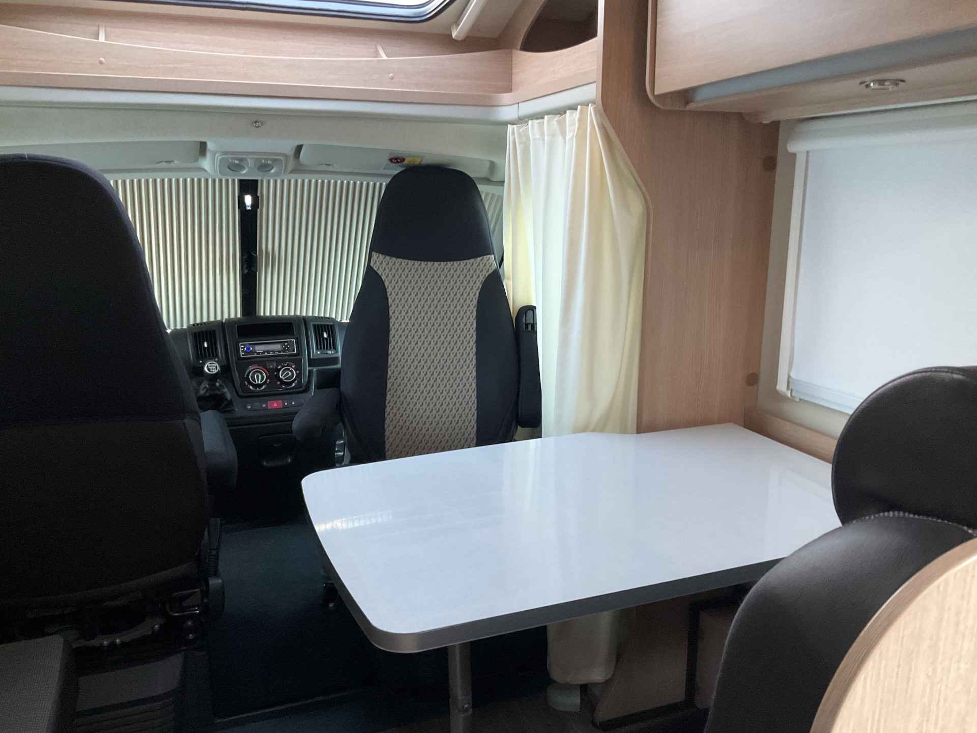 Bij binnenkomst door de schuifdeur treft u een leuke salon met daarbij de draaibare cabine zetels te gebruiken. De tafel is te plaatsen in gewenste positie.