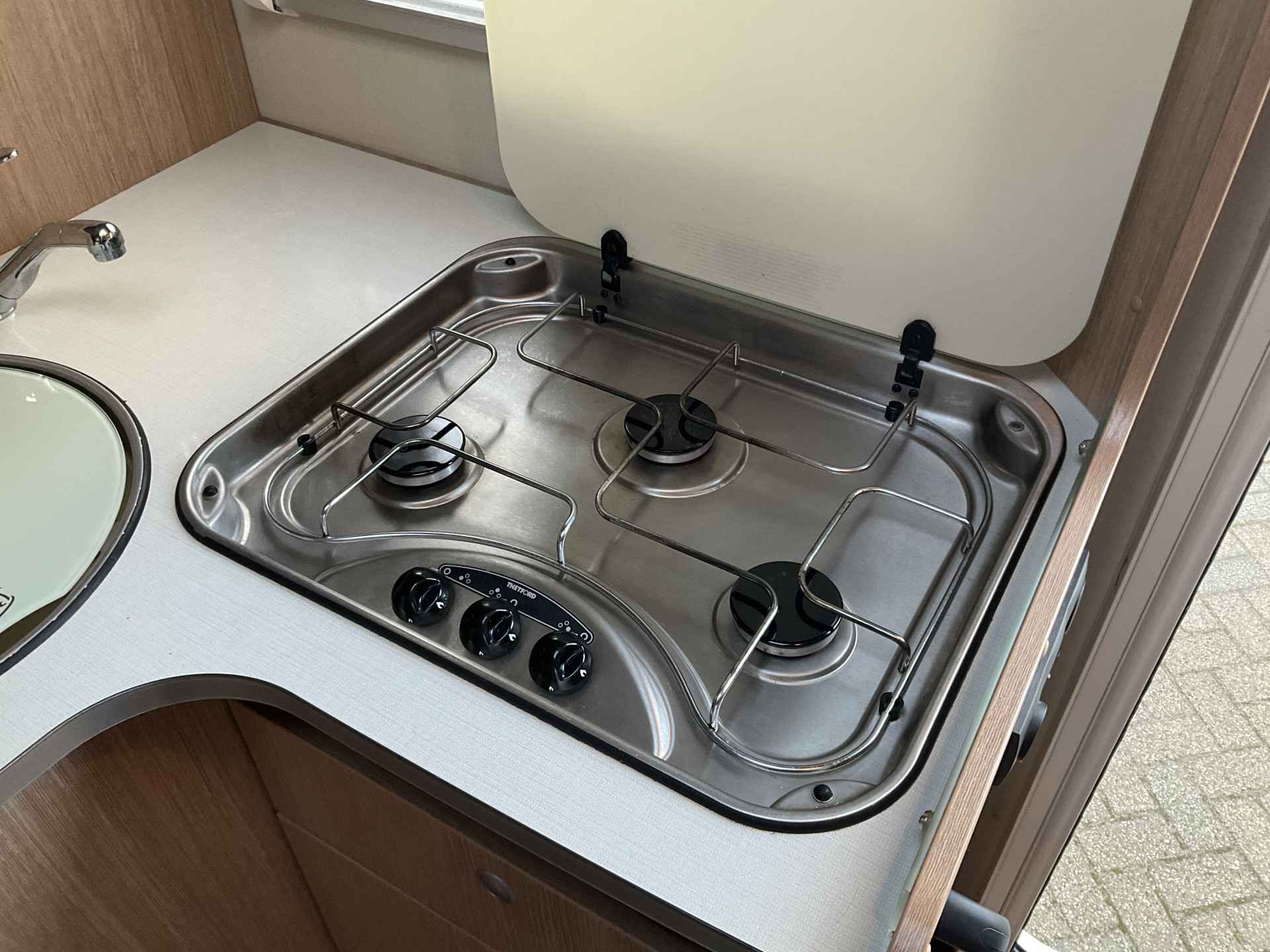 De keuken is direct naast de toegangsdeur gelegen. De keuken is voorzien van werkblad met duurzaam oppervlak, royale keukenlades in degelijke kwaliteit, rvs spoelbak, 3 pitsvuur en koel vries combinatie.