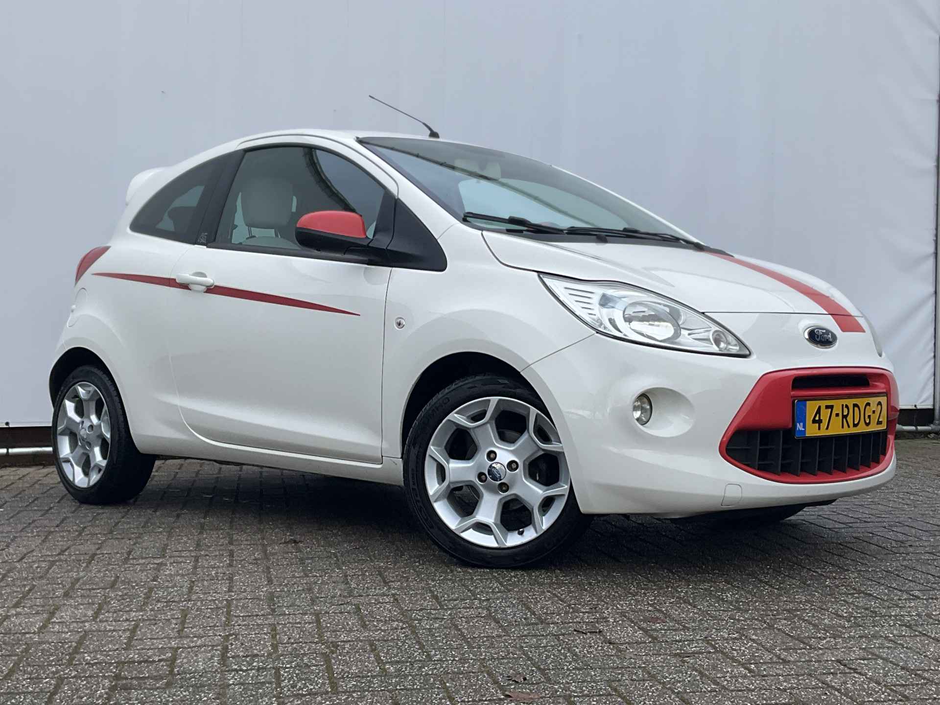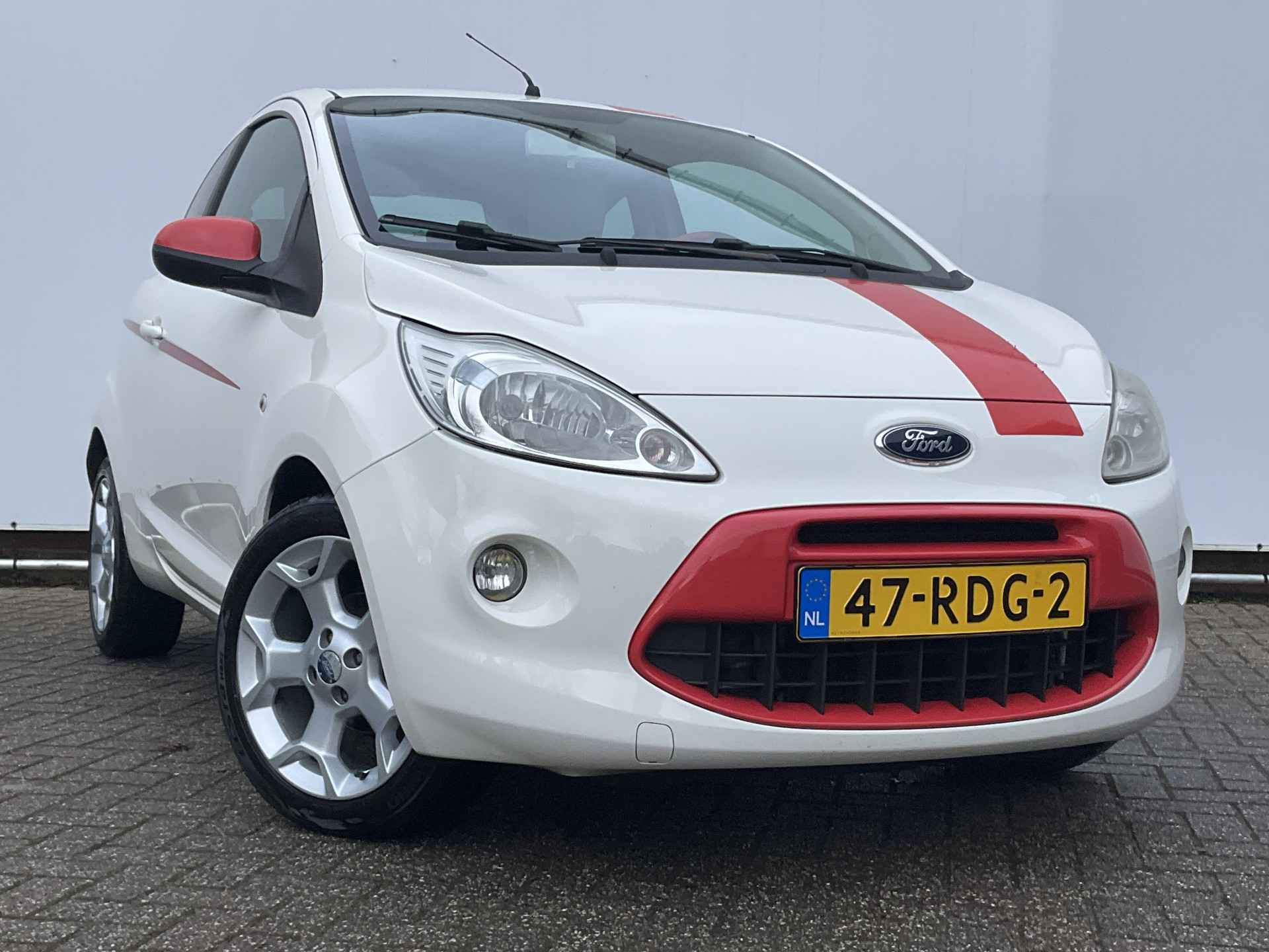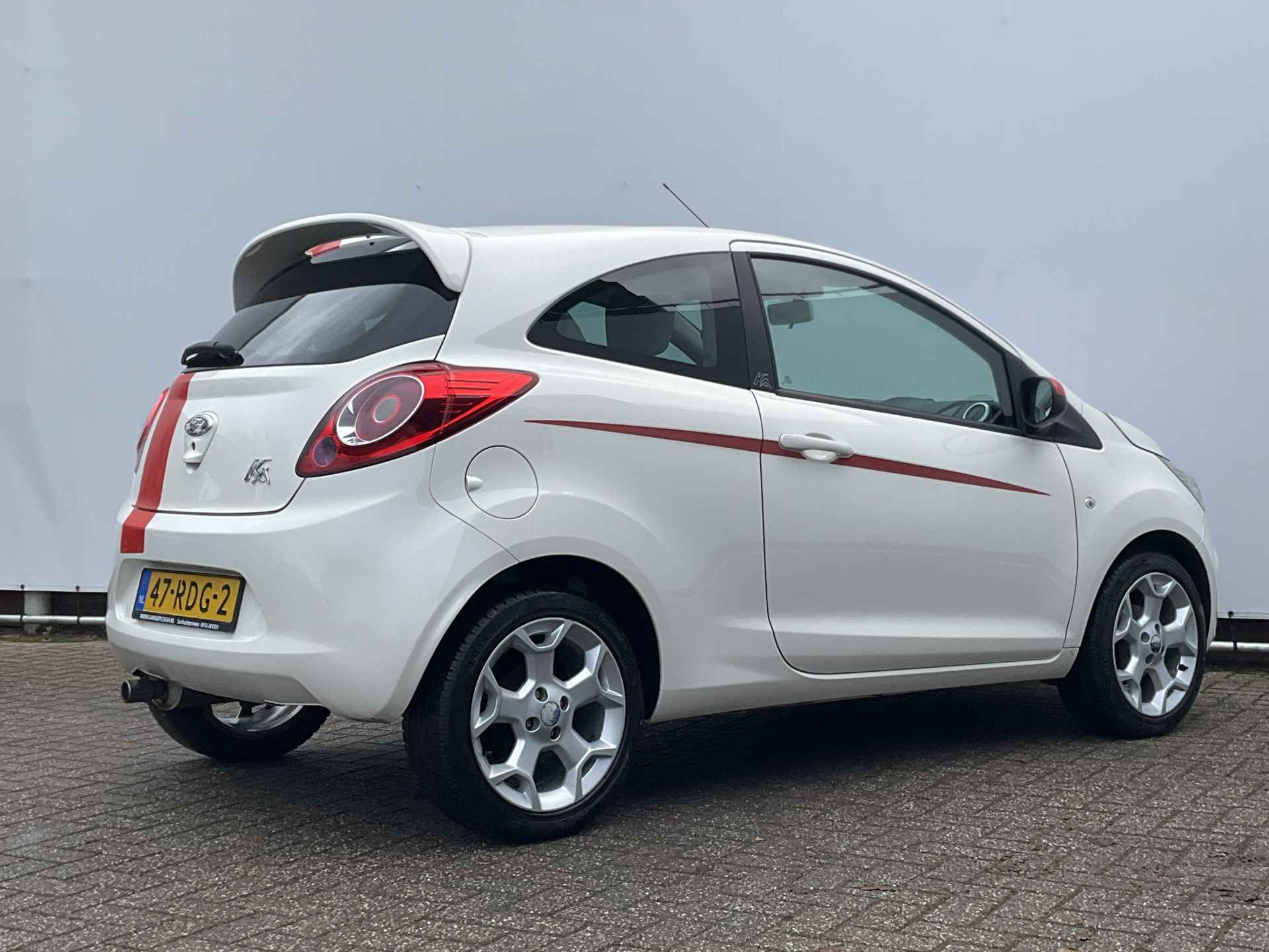 Klein zouden we 'm niet willen noemen, deze Ford Ka. Compact zeker wel. De totale ruimte is optimaal benut voor comfort en rijplezier. Hebt u een vlotte rijstijl? Dan is deze Ford met zijn zuinige maar pittige motor geknipt voor u. In de file, bij het stoplicht, voor de brug... dan heb je toch geen aandrijving nodig? Het start-stopsysteem schakelt de motor uit bij stilstand en dat scheelt flink in brandstofverbruik. Bij de zeer complete uitrusting van deze auto behoren ook 16 inch lichtmetalen velgen, donker getint glas achter en in delen neerklapbare achterbank.