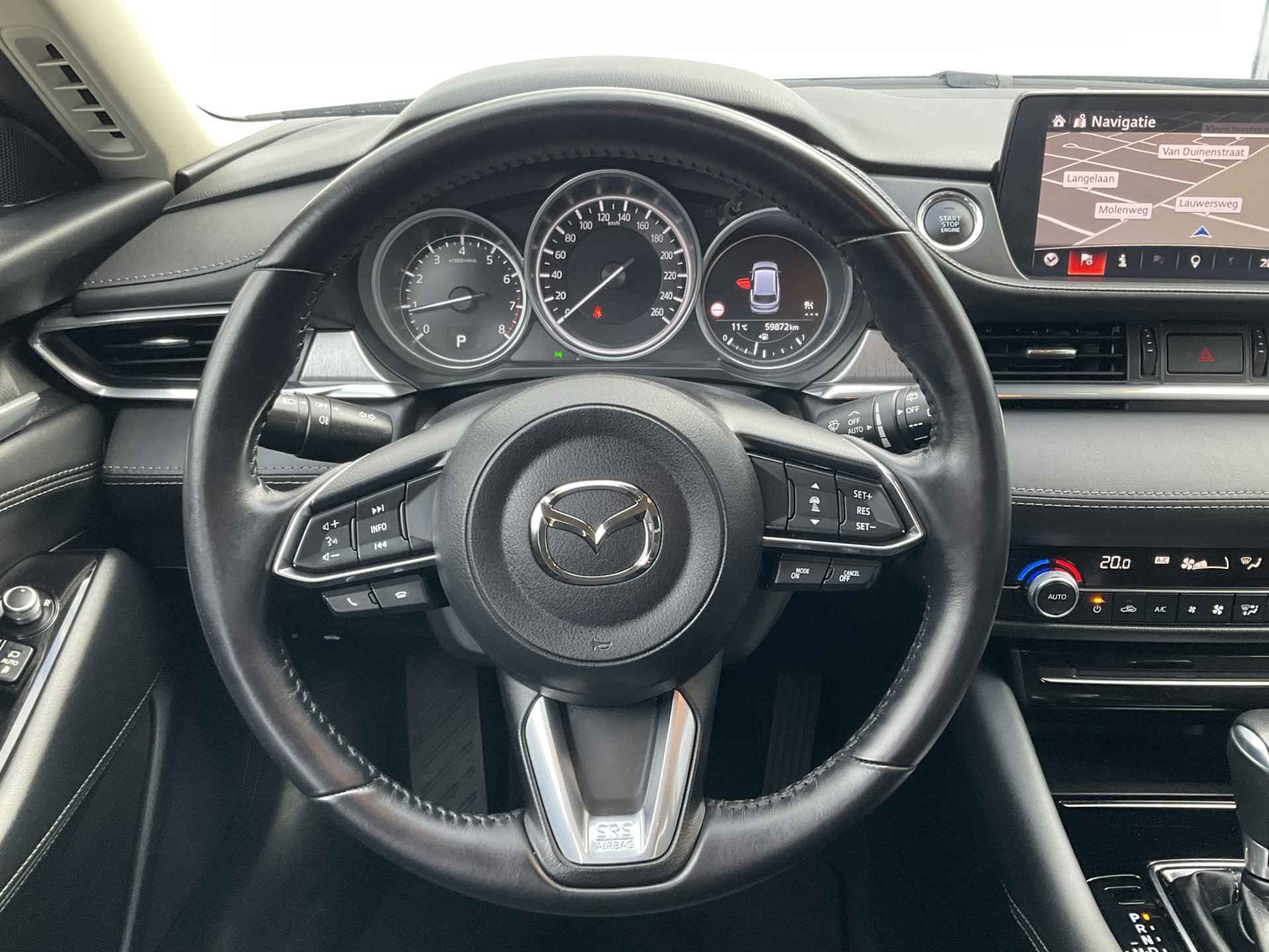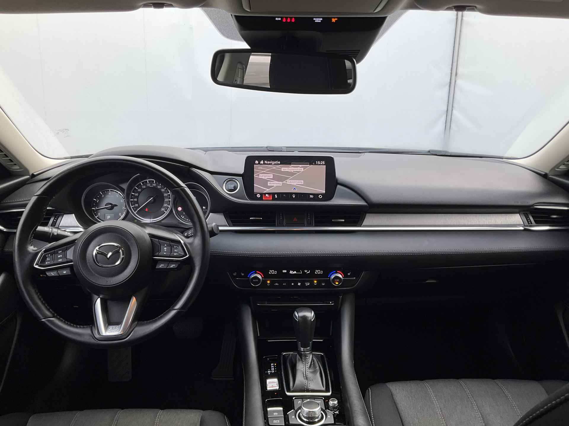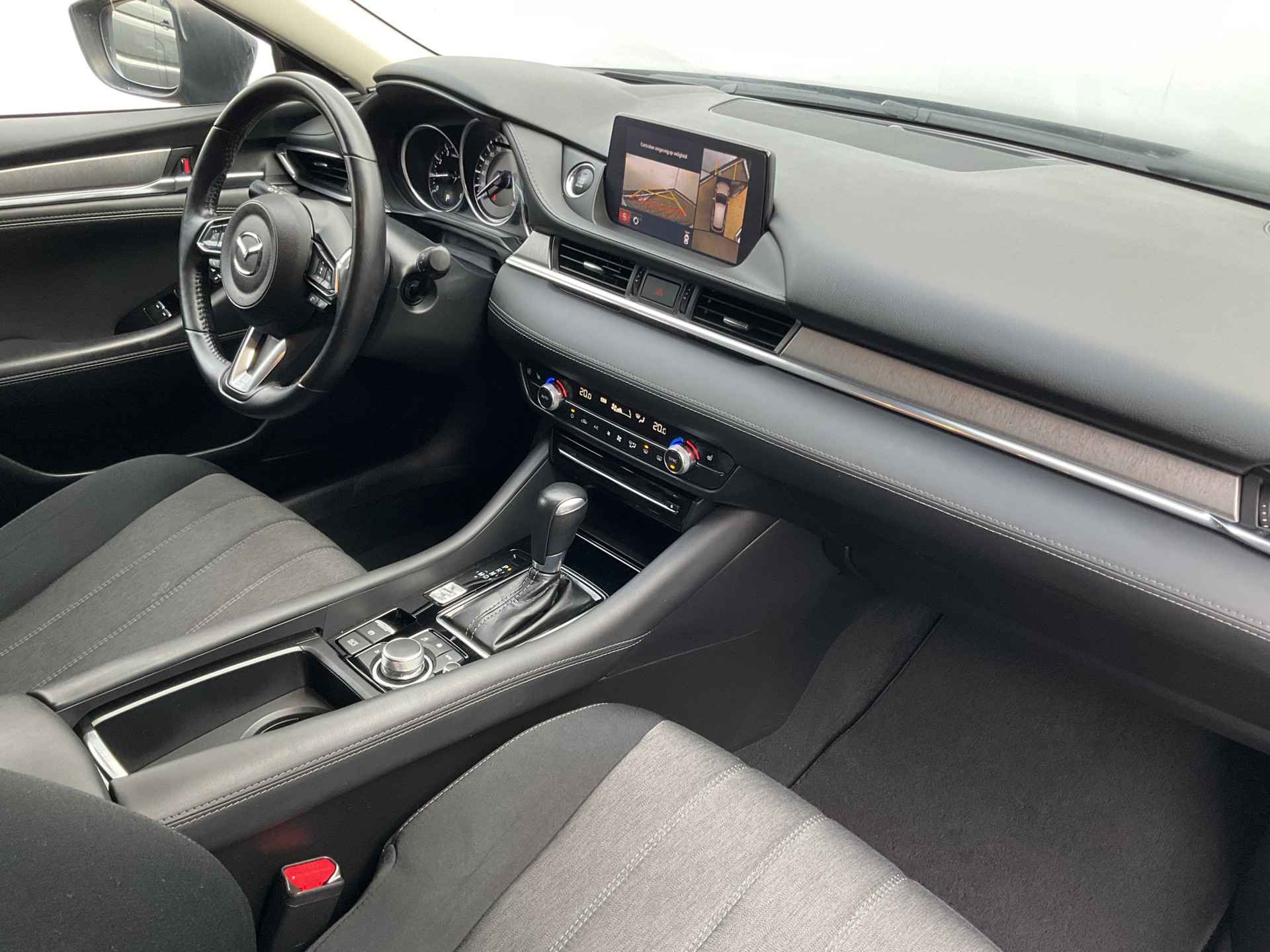 Zoals u mag verwachten van deze Mazda 6 Sportbreak is hij uitgerust met een reeks aan actieve veiligheidssystemen. Dat de auto steeds meer taken van de bestuurder overneemt, merkt u bijvoorbeeld aan het systeem voor verkeersbord-detectie in deze Mazda. Onbedoeld buiten de rijstrook raken wordt voorkomen door het Lane-keeping systeem. Mindert een voorligger onverwachts te veel vaart, dan komt de forward collision warning in actie en waarschuwt meteen. De veiligheid van deze auto wordt verder verhoogd door head-up display, dodehoekdetectie, hill hold functie, brake assist en bandenspanningcontrolesysteem.