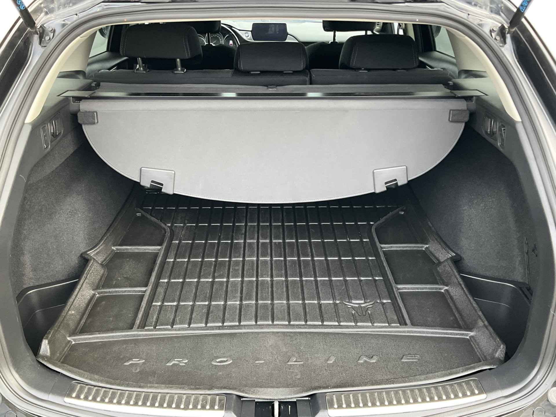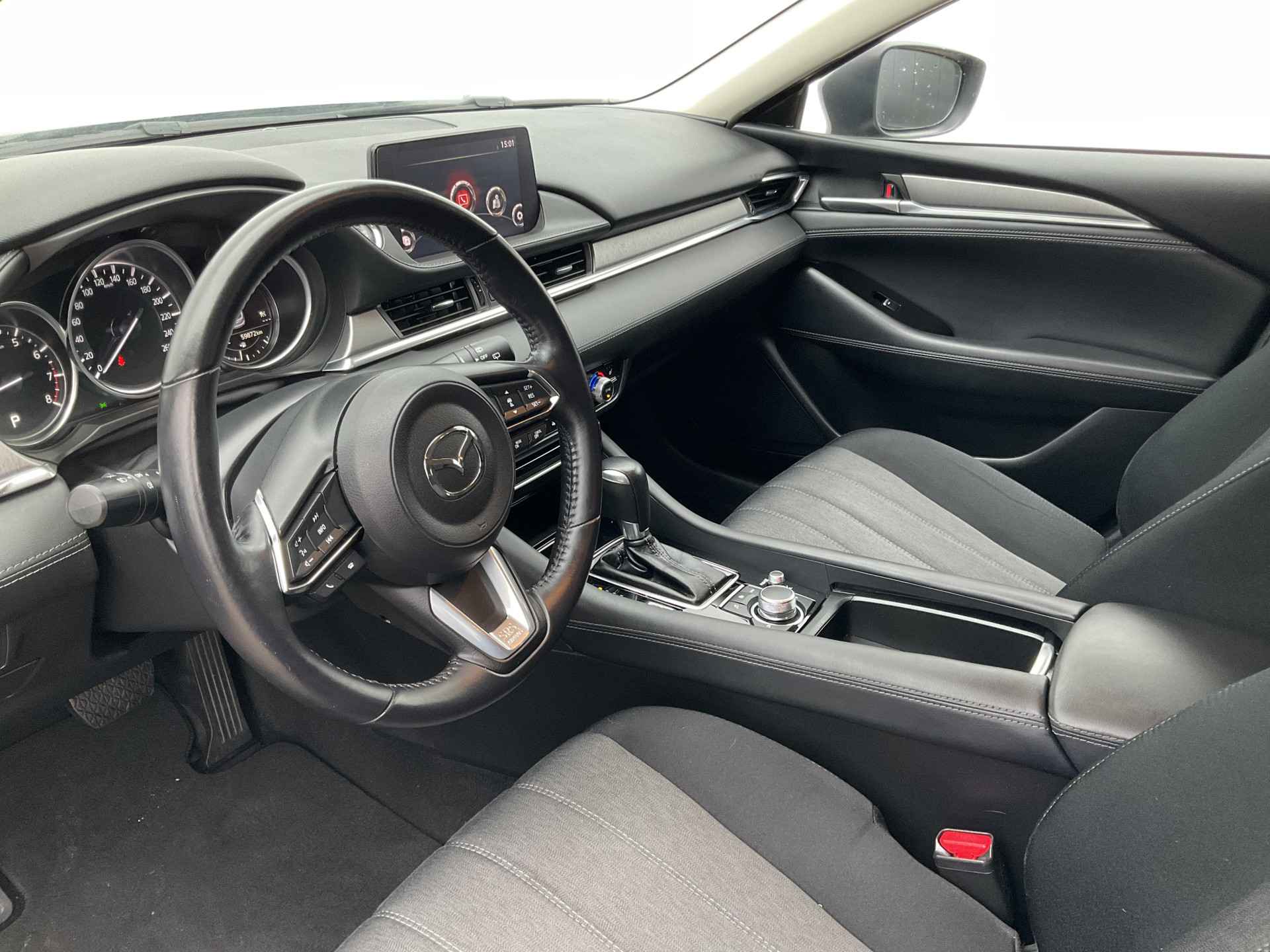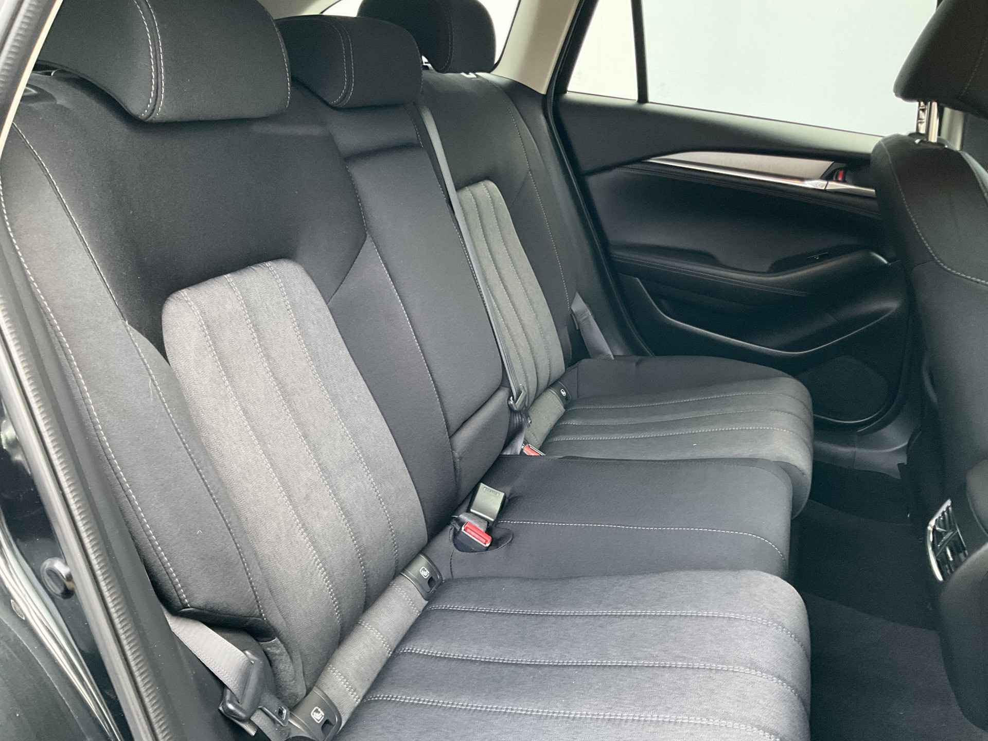 Zoals u mag verwachten van deze Mazda 6 Sportbreak is hij uitgerust met een reeks aan actieve veiligheidssystemen. Dat de auto steeds meer taken van de bestuurder overneemt, merkt u bijvoorbeeld aan het systeem voor verkeersbord-detectie in deze Mazda. Onbedoeld buiten de rijstrook raken wordt voorkomen door het Lane-keeping systeem. Mindert een voorligger onverwachts te veel vaart, dan komt de forward collision warning in actie en waarschuwt meteen. De veiligheid van deze auto wordt verder verhoogd door head-up display, dodehoekdetectie, hill hold functie, brake assist en bandenspanningcontrolesysteem.
