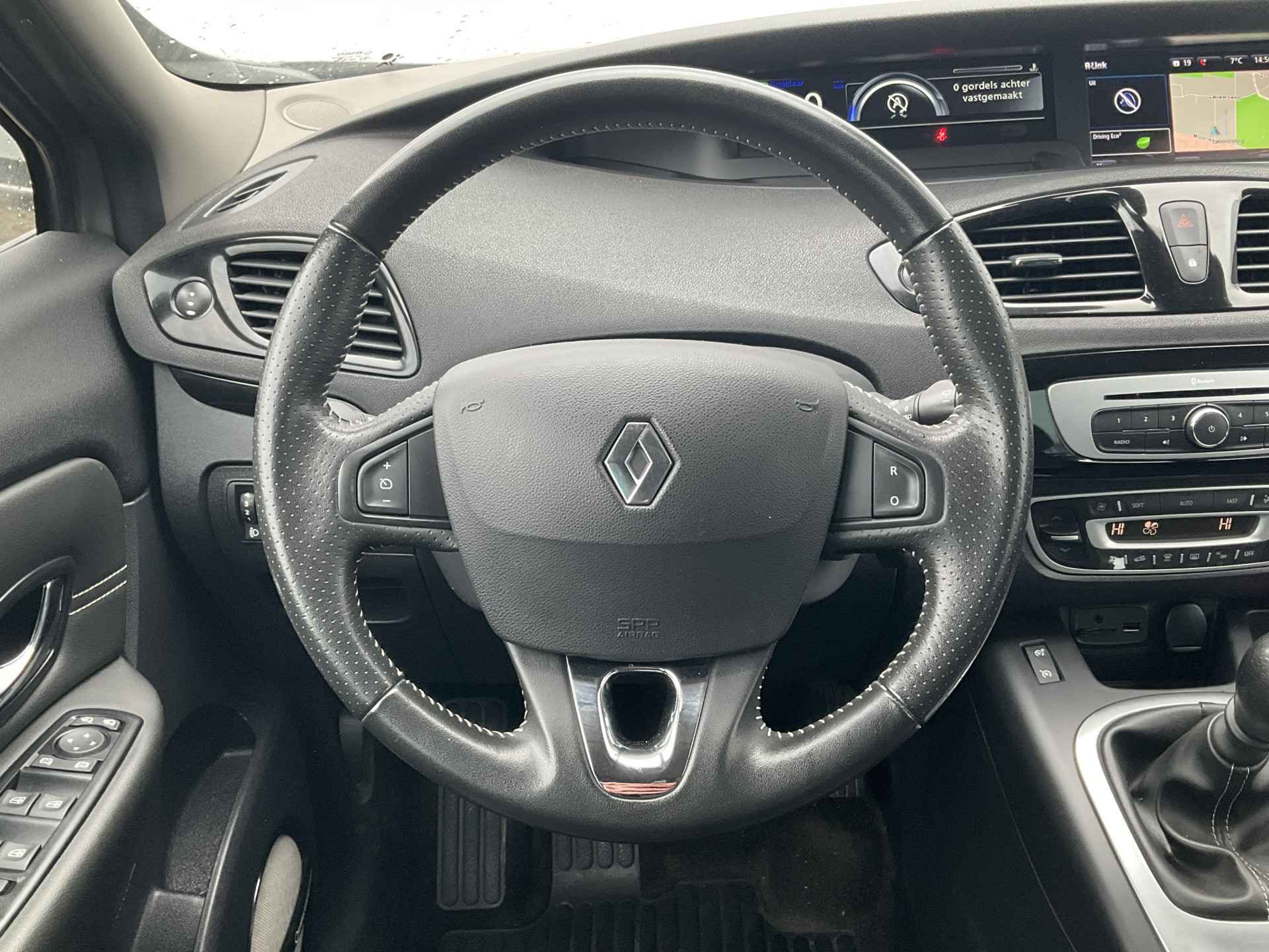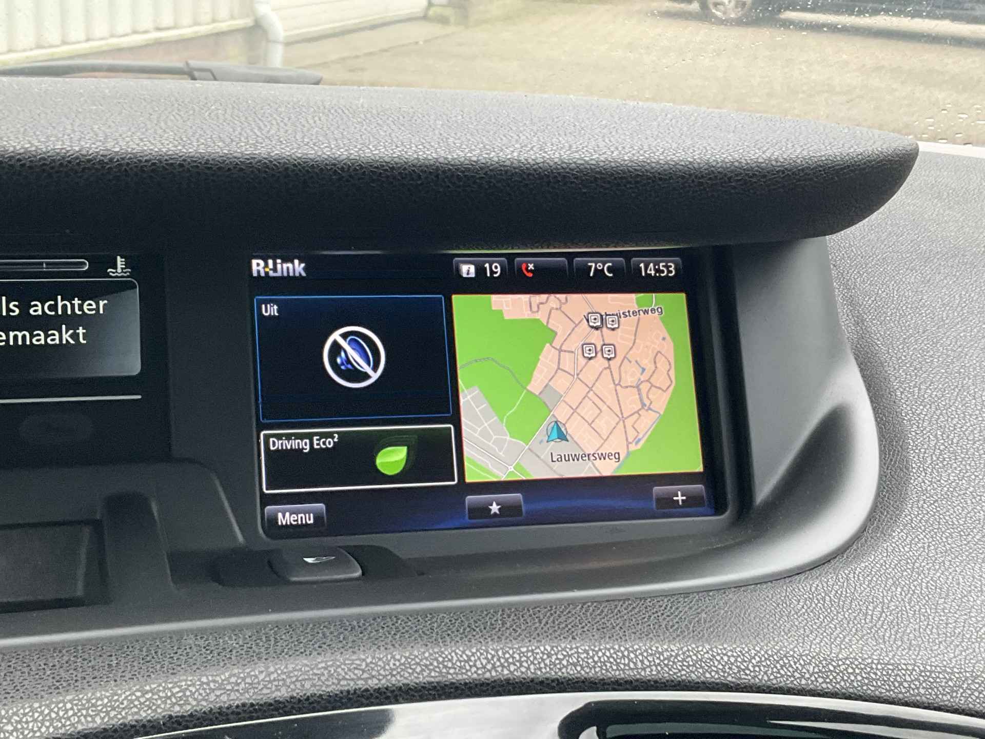 Met een gerust hart achteruitrijden? Dat kan, dankzij de achteruitrijcamera. U weet altijd waar u moet zijn, dankzij het navigatiesysteem. Tot de standaard uitrusting van deze auto hoort ook electronic climate control. Zonder uw ogen van de weg te halen bedient u de radio met de audiobediening op het stuurwiel. In deze Renault kunt u zich concentreren op het verkeer, terwijl de auto de omgeving voor u in de gaten houdt. Een automatisch inschakelbare verlichting zorgt dat de verlichting aangaat als het donkerder wordt - in tunnels bijvoorbeeld - en de regensensor schakelt de ruitenwissers in als het nodig is. U hoeft er niets aan te doen. U bent in deze Renault ook voorzien van cruise control, keyless entry, automatisch dimmende binnenspiegel, lederen stuur, boordcomputer en lederen versnellingspook.