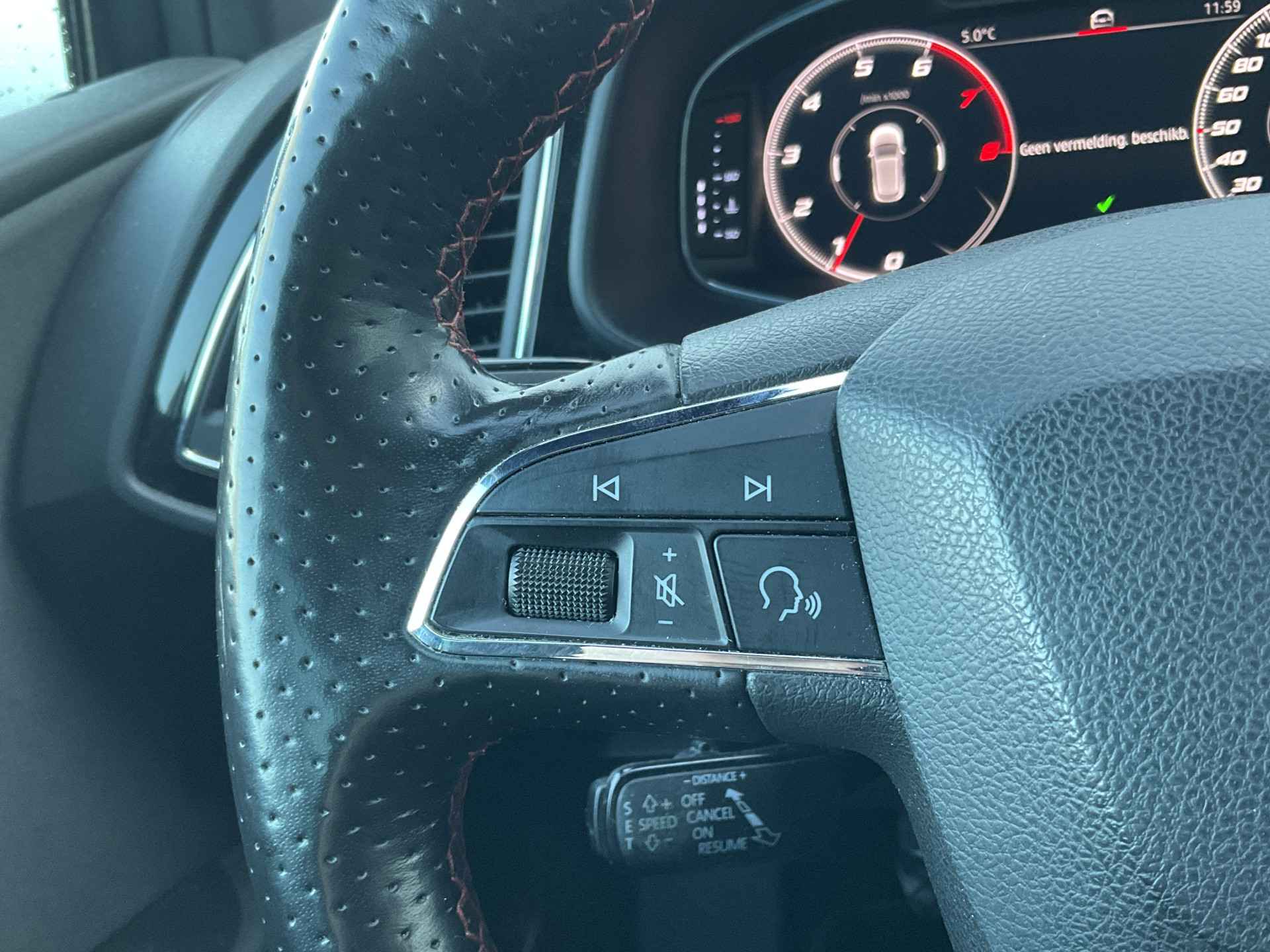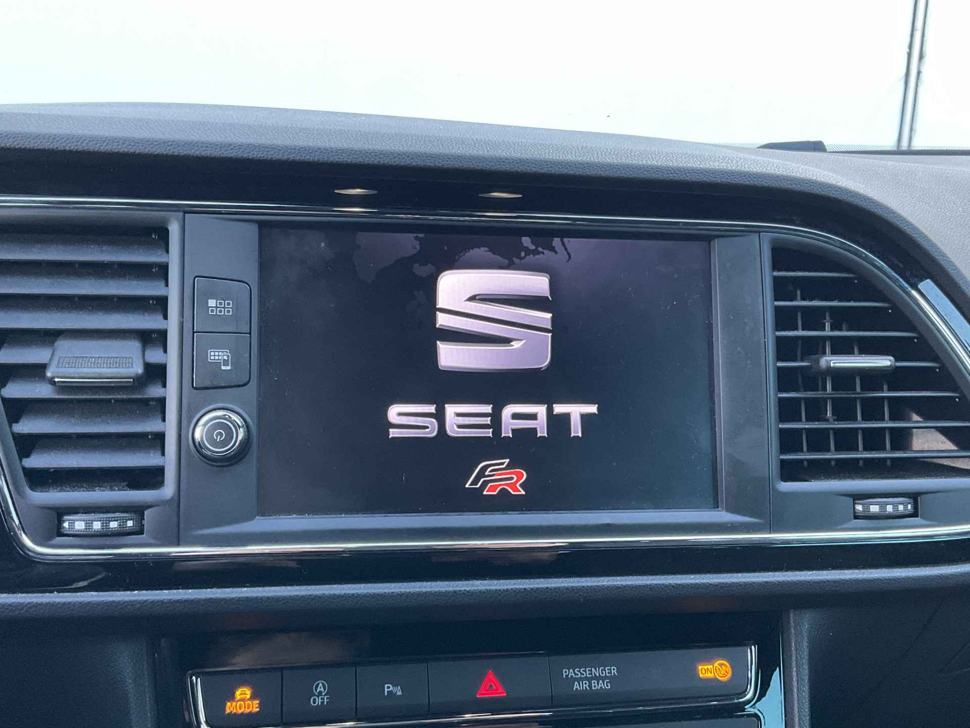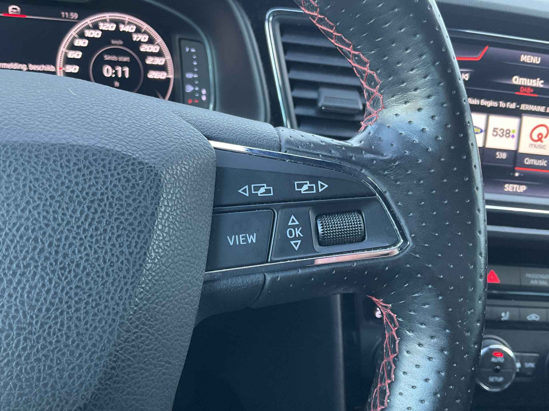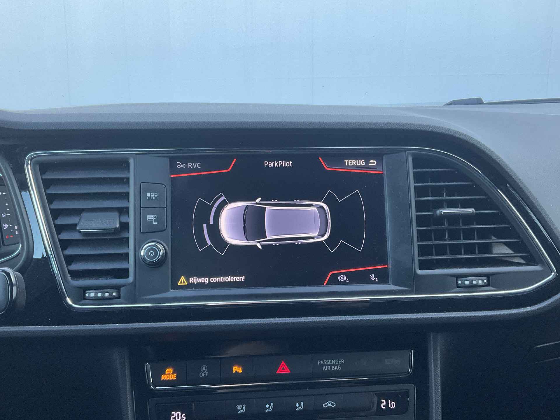 Kommaar-kommaar-kommaar, aldus de achteruitrijcamera. Iedere centimeter vrije ruimte komt haarscherp in beeld. Schadevrij inparkeren maar! Met adaptive cruise control houdt de auto zelfstandig afstand tot uw voorligger. Een veiligheidsverhogende optie waarmee u comfortabel onderweg bent. Onderweg kunt u veilig genieten van het audio-installatiesysteem met DAB-radio en het navigatiesysteem. Want in deze SEAT bedient u ze vanaf het stuurwiel of met uw stem. Smartphone in het rood? Geen punt, de draadloze telefoonlader zorgt voor een volle accu. Automatische airconditioning verwarmt of koelt het interieur met een druk op de knop. Met regensensor, sportstuurwiel, keyless entry, automatisch dimmende binnenspiegel, boordcomputer en lederen versnellingspook is deze SEAT helemaal compleet.